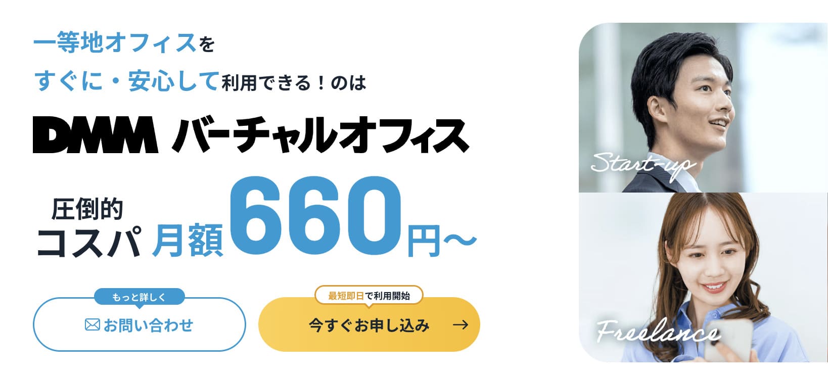 当サイトがおすすめするバーチャルオフィスはGMOオフィスサポート・DMMバーチャルオフィスの2社。コスパ良く都内や地方一等地の住所をレンタル可能。実際の利用者の口コミも良好です。