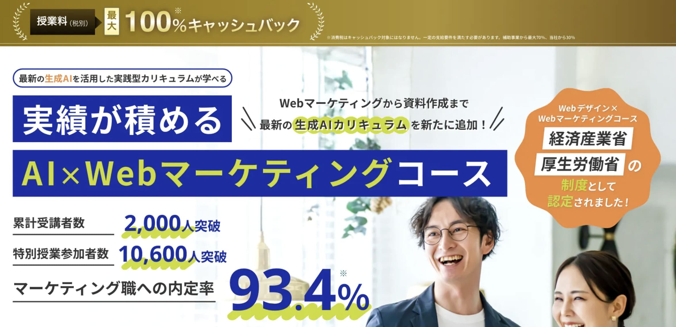 ・卒業後の案件紹介・転職サポートあり ・リスキリング補助金で受講料最大70%割引 ・転職・就職成功率93% ・現役のWebマーケターが講師 |